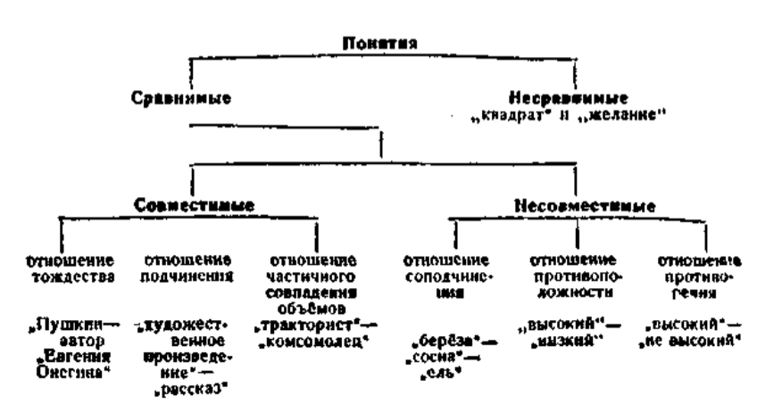 Между несовместимыми понятиями также существуют три вида отношений: отношение соподчинения, отношение противоположности и отношение противоречия.